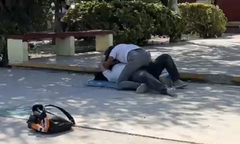 En las imágenes se observa a dos jóvenes de segundo grado discutiendo, hasta que, incitadas por otros compañeros, comienzan a agredirse físicamente. La riña escala cuando una de ellas derriba a la otra y continúa golpeándola en el suelo, mientras ambas se sujetan del cabello en medio de gritos y empujones.