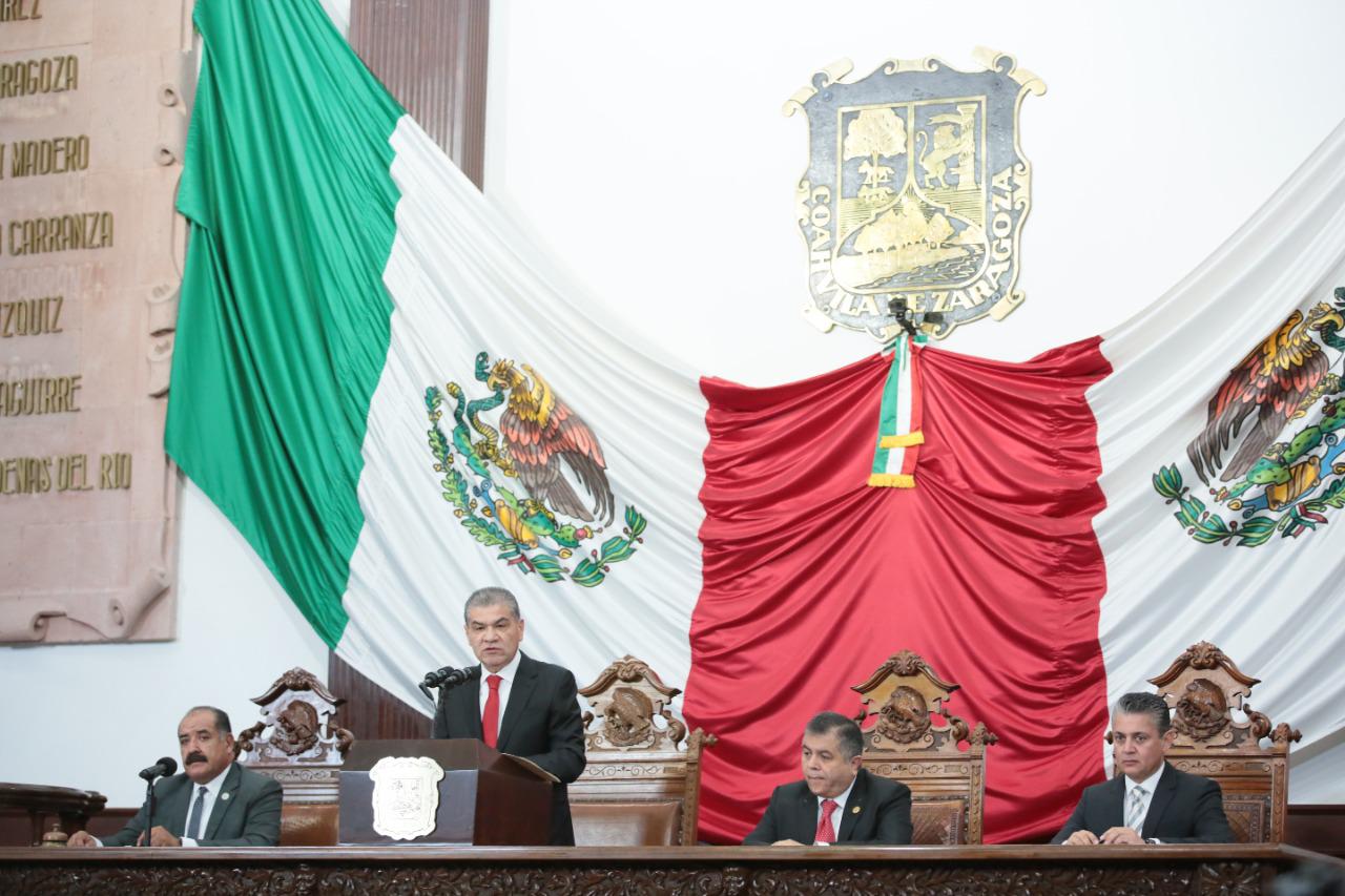 En un mensaje en el que destacó el trabajo en unidad de la sociedad coahuilense mediante el que se ha logrado mantener la paz y la tranquilidad, así como el desarrollo social incluyente y económico del Estado, el Gobernador Miguel Ángel Riquelme Solís acudió ante el Pleno del Congreso Local para presentar su Quinto Informe de Gobierno, en cumplimiento a lo establecido en la Constitución Política del Estado Independiente, Libre y Soberano de Coahuila de Zaragoza.