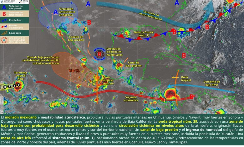 La Secretaría de Gobierno, a través de la Subsecretaría de Protección Civil del Estado, informa que una masa de aire frío proveniente de Estados Unidos reforzará al Frente Frío Número 1, el cual se extenderá con características de estacionario sobre el noreste de México. Este fenómeno ocasionará rachas de viento de 40 a 60 km/h, un descenso en las temperaturas en entidades del norte y noreste del país, así como lluvias puntuales muy fuertes en Coahuila.