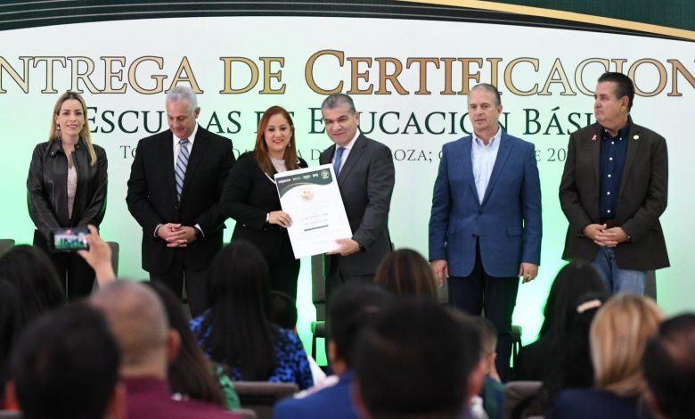 Entrega gobernador Miguel Riquelme certificaciones a escuelas de educación básica de las regiones Laguna y Centro-Desierto.