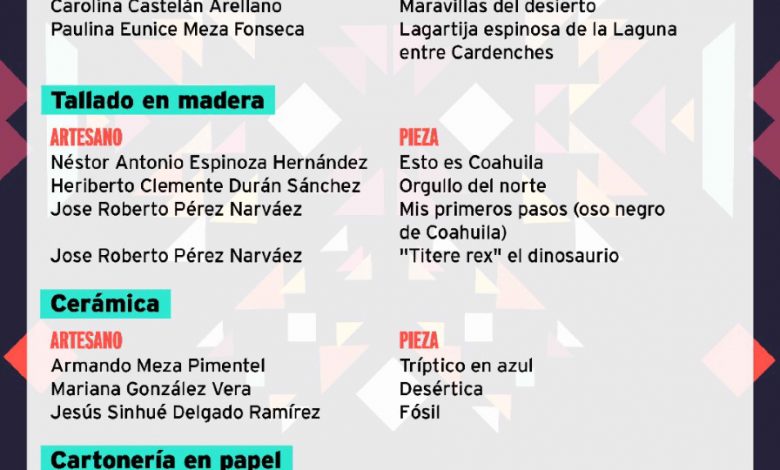 + Tallado en Madera, en la que resultaron preseleccionados Néstor Antonio Espinoza Hernández, “Esto es Coahuila”; Heriberto Clemente Durán Sánchez, “Orgullo del norte”; José Roberto Pérez Narváez, “Mis primeros pasos (Oso negro de Coahuila)” y «Títere Rex» El Dinosaurio.