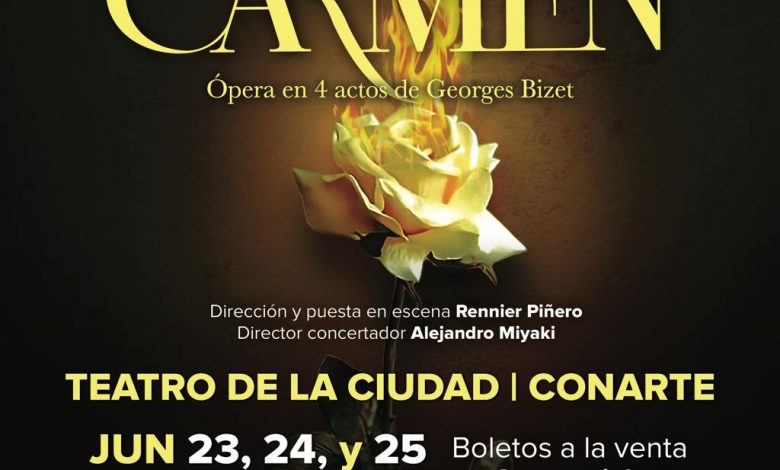 La Ópera Carmen se presentará el viernes 23 y sábado 24 a las 20:00 horas, y el domingo 25 de junio a las 18:00 horas, en la Gran Sala del Teatro de la Ciudad de Monterrey, N.L. CONARTE.