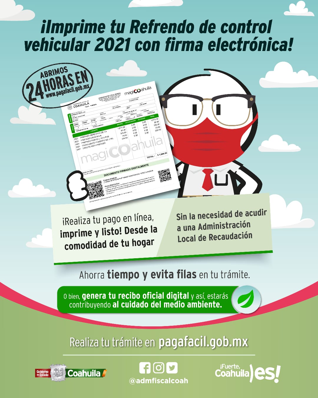 El Administrador detalló: “La implementación de la firma electrónica ha beneficiado a miles de contribuyentes coahuilenses que realizaron su trámite de Refrendo 2021 sin la necesidad de acudir por sus documentos a una oficina de recaudación”, explicó.