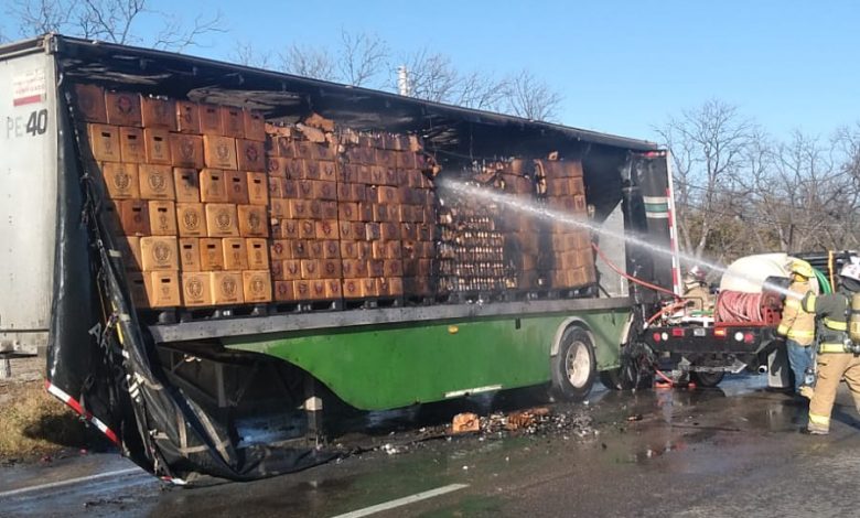 La unidad siniestrada transportaba envases de cerveza vacíos y, de acuerdo con información proporcionada por autoridades de Protección Civil, el fuego se originó a consecuencia de un corto circuito en el tractocamión de doble remolque.