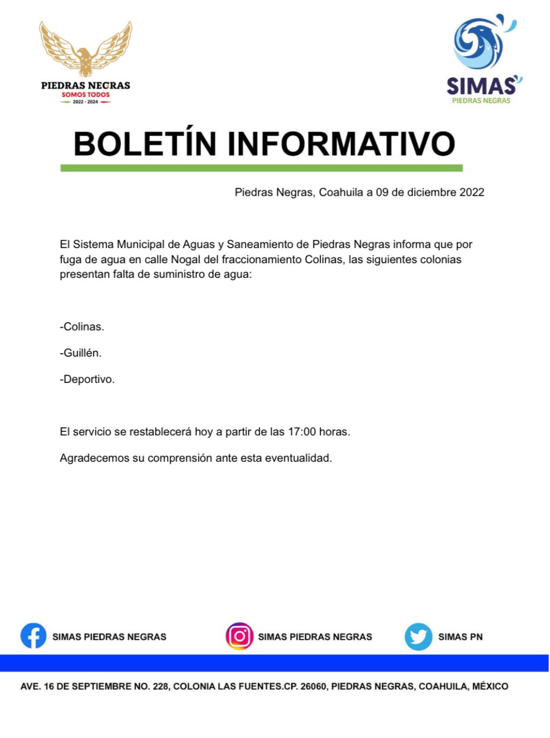 El Sistema Municipal de Agua y Saneamiento de Piedras Negras dio a conocer a través de un boletín informativo sobre la falla del suministro en algunos de los sectores de la ciudad, durante este viernes.