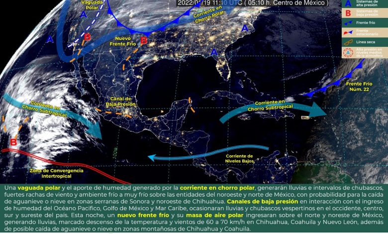 De acuerdo al Servicio Meteorológico Nacional, una vaguada polar sobre el noroeste del País, interacciona con el aporte de humedad favorecido por la corriente en chorro polar, generarán lluvias e intervalos de chubascos, fuertes rachas de viento y ambiente frío a muy frío sobre las entidades del noroeste y norte del territorio nacional.