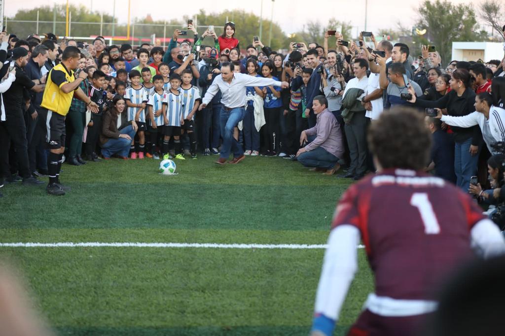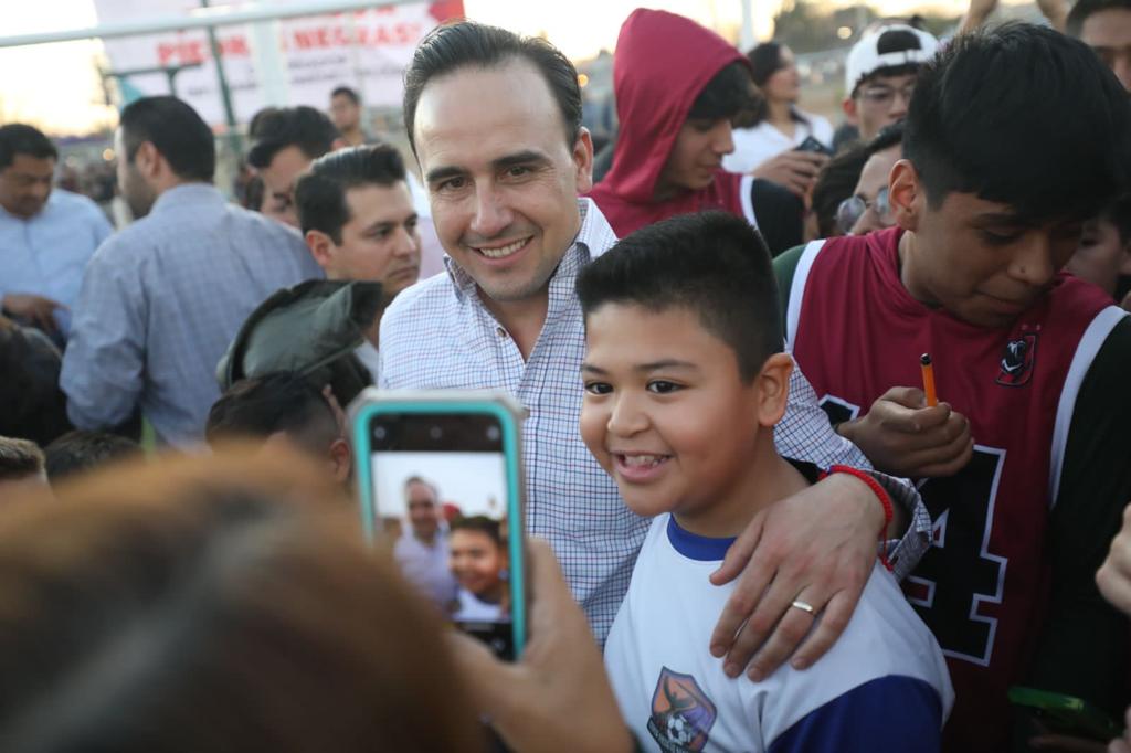Acompañado por su esposa Paola Rodríguez López, el gobernador de Coahuila detalló que en esta cancha se mejoraron las instalaciones, se instaló pasto sintético, se construyeron vestidores con baño y una banca para los jugadores, y se realizó una zona de esparcimiento y descanso con mesas de picnic, para brindar esparcimiento a las familias que acuden diariamente a la Macroplaza.