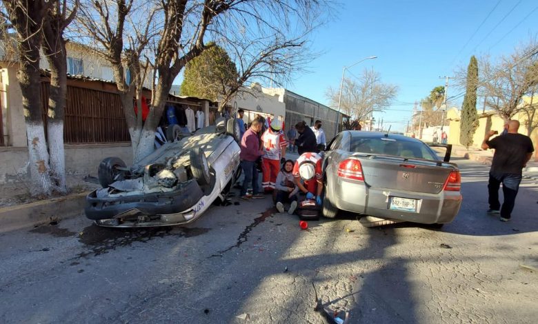 Tras el impacto el taxi quedó volcado, en donde resultaron lesionados del chofer y una pasajera de 21 años de edad.
