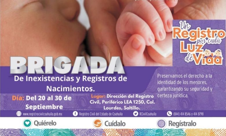 Con el objetivo de continuar garantizando el Derecho a la Identidad de las niñas y niños de Coahuila, el Gobierno del Estado, a través del Registro Civil, llevará a cabo una brigada de inexistencias y registro de nacimientos, atendiendo los protocolos de salud marcados para evitar la propagación del Covid-19.