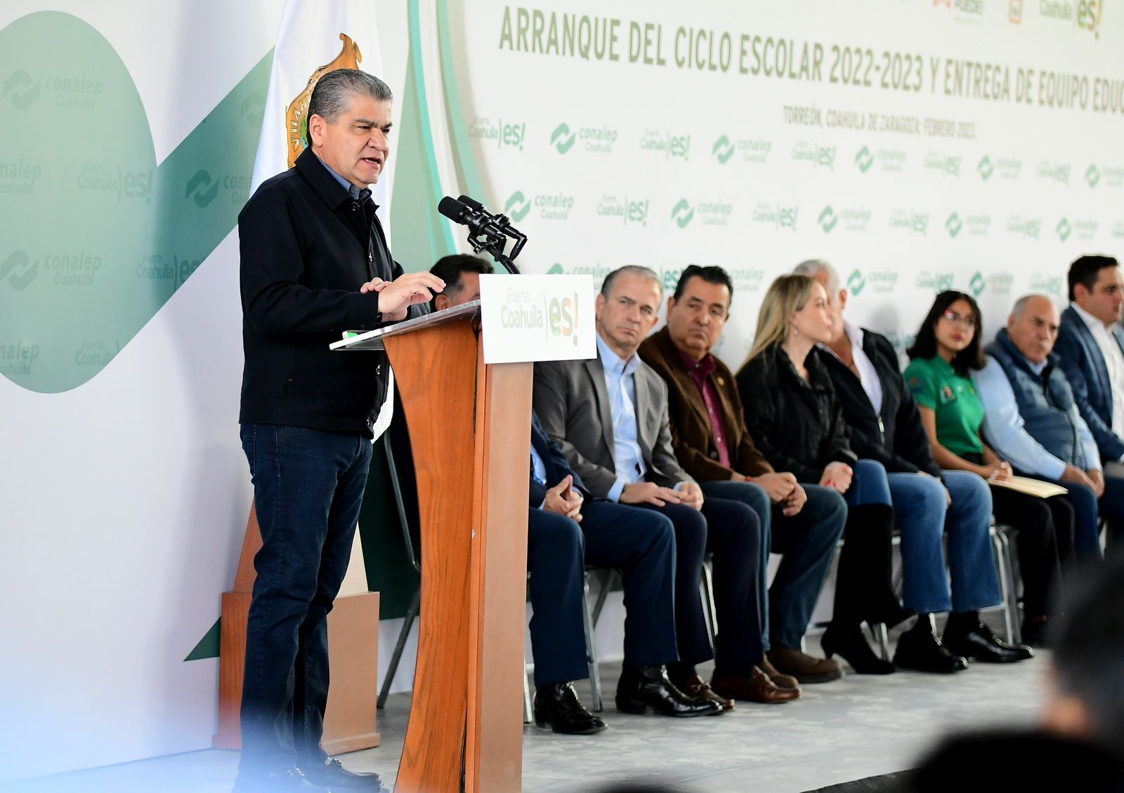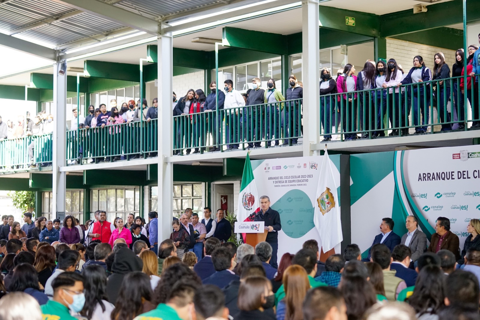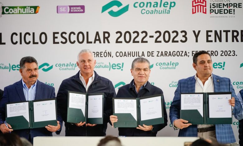 El gobernador Miguel Ángel Riquelme Solís encabezó la ceremonia de inicio del Ciclo Escolar 2022-2023 en el Conalep de esta ciudad, en donde además entregó equipo educativo y firmó, como Testigo de Honor, un convenio de colaboración entre esta institución y la Coparmex.