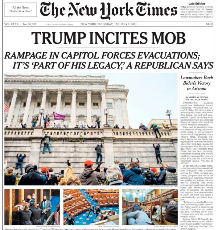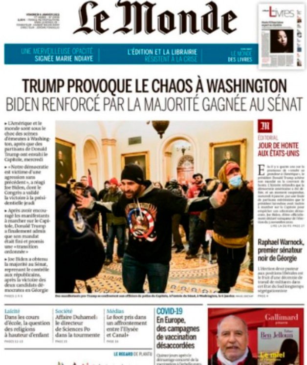 La toma del Capitolio por los simpatizantes del presidente saliente de Estados Unidos, Donald Trump, ocupó las primeras planas de los medios más importantes del mundo, por encima de la ratificación de Joe Biden como mandatario.