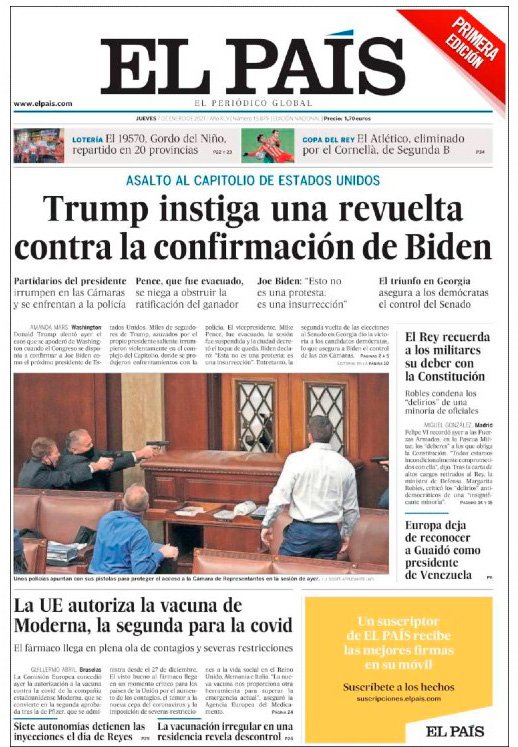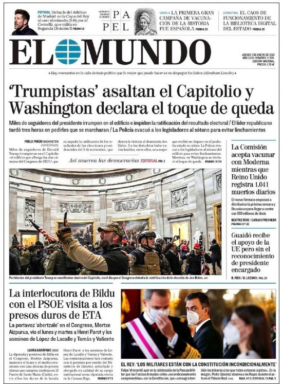 Medios como New York Times, Washington Post, la República, El País y El Mundo destacan en sus primeras planas imágenes de los disturbios que dejaron cuatro muertos durante la sesión del Congreso para certificar los votos del Colegio Electoral que daban la victoria a Biden.