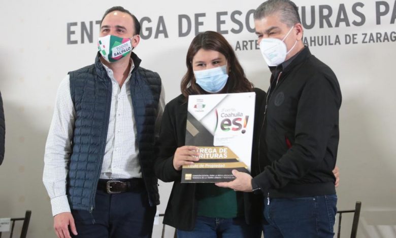 Miguel Riquelme entregó físicamente sus escrituras a Nora Linda Pedraza, Lucely Reyes Acosta, Karla Lizeth. En tanto, de Arteaga a Joel Anastasio Lerma, Francisco Guadalupe Hernández Cázares y Jazmín Medina González, mientras que de Ramos Arizpe recibieron su documento, José Guadalupe Rocha, María Guadalupe Hernández Gutiérrez y San Juana Reyes Maciel.