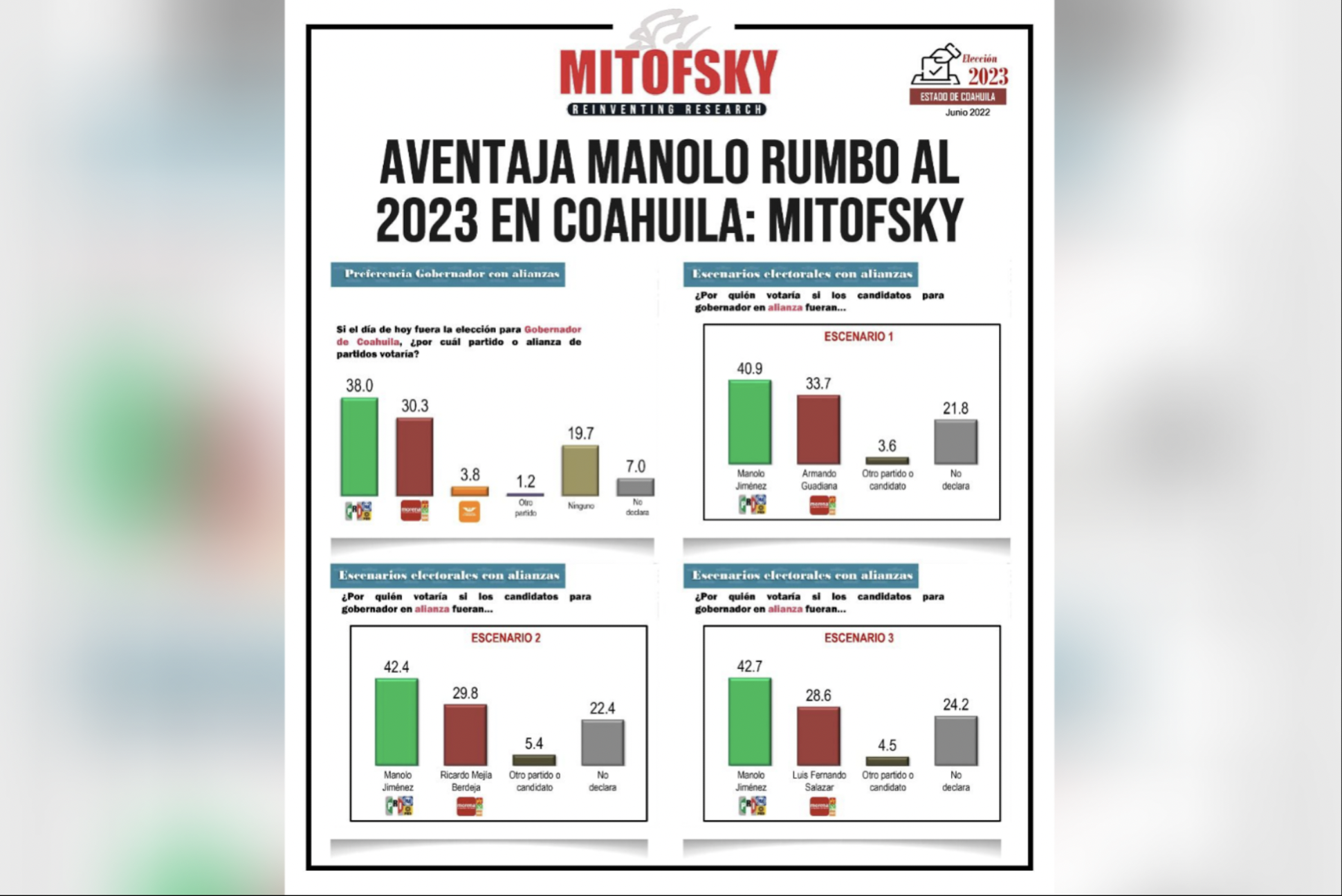 De acuerdo a la más reciente encuesta de Mitofsky sobre las preferencias rumbo a la gubernatura de Coahuila en el 2023, Manolo Jiménez Salinas tiene una ventaja de 8 puntos sobre Armando Guadiana; 13 sobre Ricardo Mejía Berdeja y 14 puntos arriba de Luis Fernando Salazar.