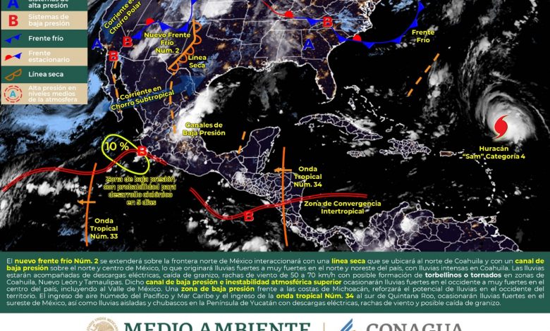 Este sistema interaccionará con una línea seca que se ubicará al norte de Coahuila y con un canal de baja presión sobre el norte y centro de México, lo que originará lluvias puntuales fuertes a muy fuertes sobre el norte y noreste del País, con lluvias puntuales intensas en el estado.