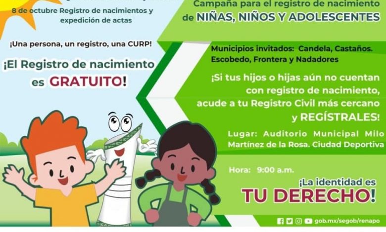 Dentro de la Campaña de Registro de Nacimiento de Niñas, Niños y Adolescente y el objetivo de garantizar el Derecho a la Identidad de las niñas y niños de Coahuila, el Gobierno del Estado (a través del Registro Civil y en coordinación con los gobiernos municipales) llevará a cabo una brigada de registro de nacimientos y aclaraciones.