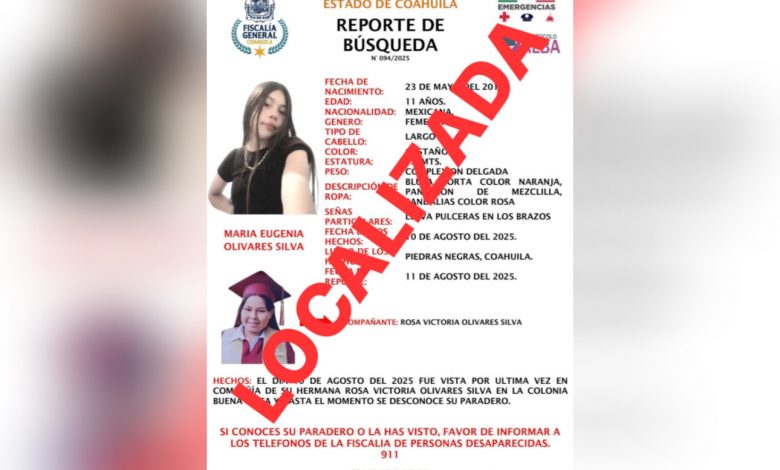 La Fiscalía General del Estado de Coahuila confirmó la localización de María Eugenia Olivares Silva y Rosa Victoria Olivares Silva, menores de edad que habían sido reportadas como desaparecidas desde el pasado 10 de agosto en la colonia Buena Vista de Piedras Negras.
