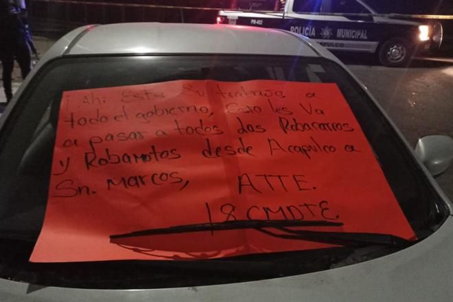 En el parabrisas de la parte delantera de la unidad automotriz fue hallada una cartulina con el siguiente mensaje: «ahí está su basura a todo el Gobierno, esto les va a pasar a todos los roba carros y roba motos desde San Marcos hasta Acapulco».