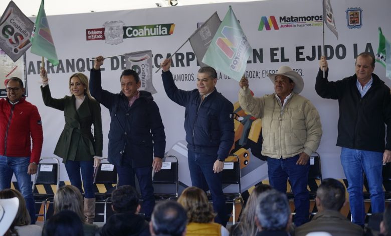 Miguel Riquelme y Miguel Ramírez dan banderazo a recarpeteo en el Ejido La Purísima, en Matamoros