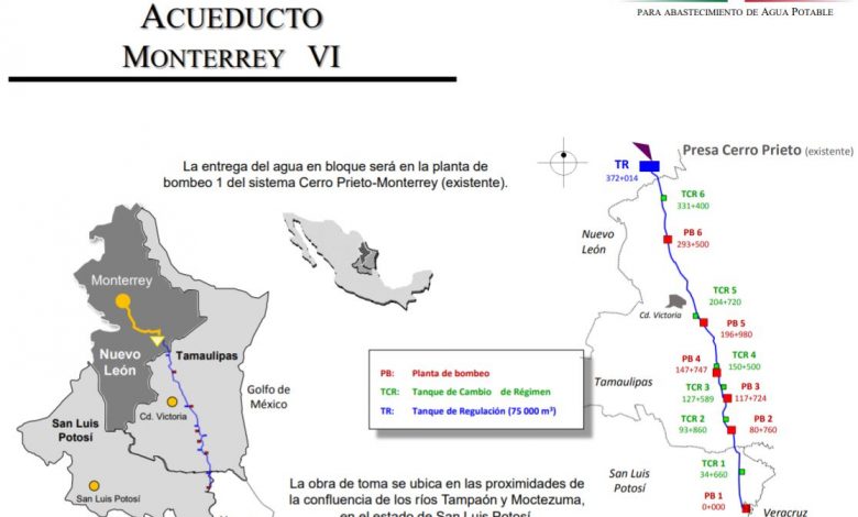Monterrey VI pretende un acueducto de 391 kilómetros de largo, desde la Obra de Toma en Ébano, San Luis Potosí, hasta la presa Cerro Prieto, sin comprometer el caudal que capta actualmente esta presa.