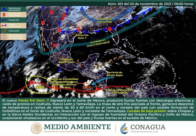 Este miércoles 3 de noviembre se pronostican lluvias puntuales fuertes para regiones de Chiapas, Coahuila, Nuevo León y Tamaulipas; intervalos de chubascos en zonas de Colima, Durango, Guerrero, Jalisco, Michoacán, Nayarit, Oaxaca, Quintana Roo, San Luis Potosí, Tabasco, Veracruz y Zacatecas, y lluvias aisladas (de 0.1 a 5 mm) en Campeche, Estado de México, Morelos y Sinaloa.