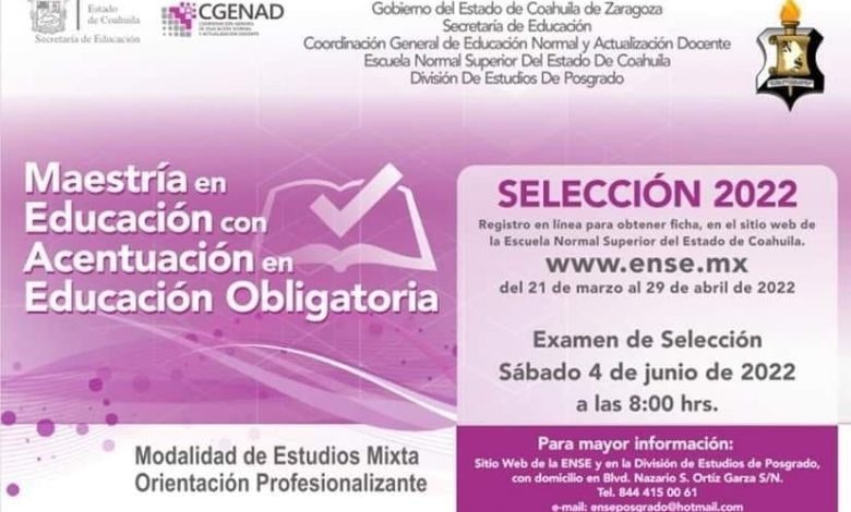 Dirigida a quienes cuentan con título en Licenciatura en Educación o afines a la misma, la Secretaría de Educación del Estado convoca a registrarse para ingresar al programa de Maestría en Educación con Acentuación en Educación Obligatoria (Educación Básica y Educación Media Superior), que ofrece la Escuela Normal Superior del Estado de Coahuila.