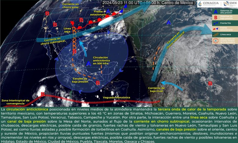La Subsecretaría de Protección Civil del Estado (PC) ha informado que, este jueves, la circulación anticiclónica posicionada en niveles medios de la atmósfera mantendrá la tercera onda de calor de la temporada, con temperaturas superiores a los 45 °C.