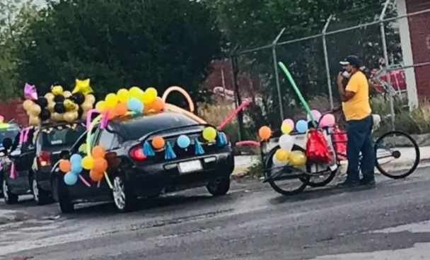 En la publicación se puede ver a un hombre formado en la fila de coches con su triciclo adornados de globos de colores.
