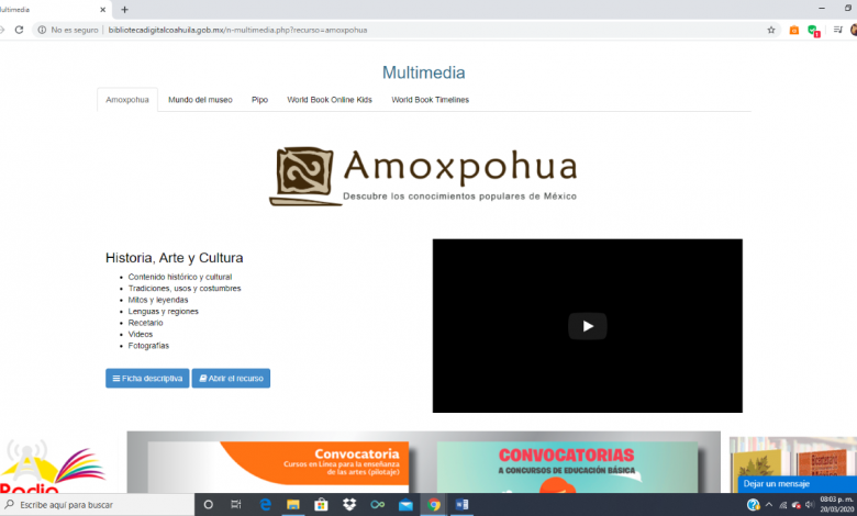 Al ingresar a la página, el usuario conocerá Amoxpohua, una plataforma tecnológica que ofrece un panorama amplio sobre arqueología, costumbres, tradiciones, gastronomía y atractivos turísticos de México; Mundo del Museo, portal para visitar de forma digital el Prado, el Louvre, Smithsonian y otros; Pipo Club, que contiene más de 2 mil juegos de vocabulario, música, geografía e inglés para niños de entre 2 y 12 años de edad; World Book Online para Niños, con enciclopedias y herramientas interactivas de análisis comparativo; World Book Timelines, herramienta para la enseñanza del idioma inglés y líneas de tiempo interactivas.