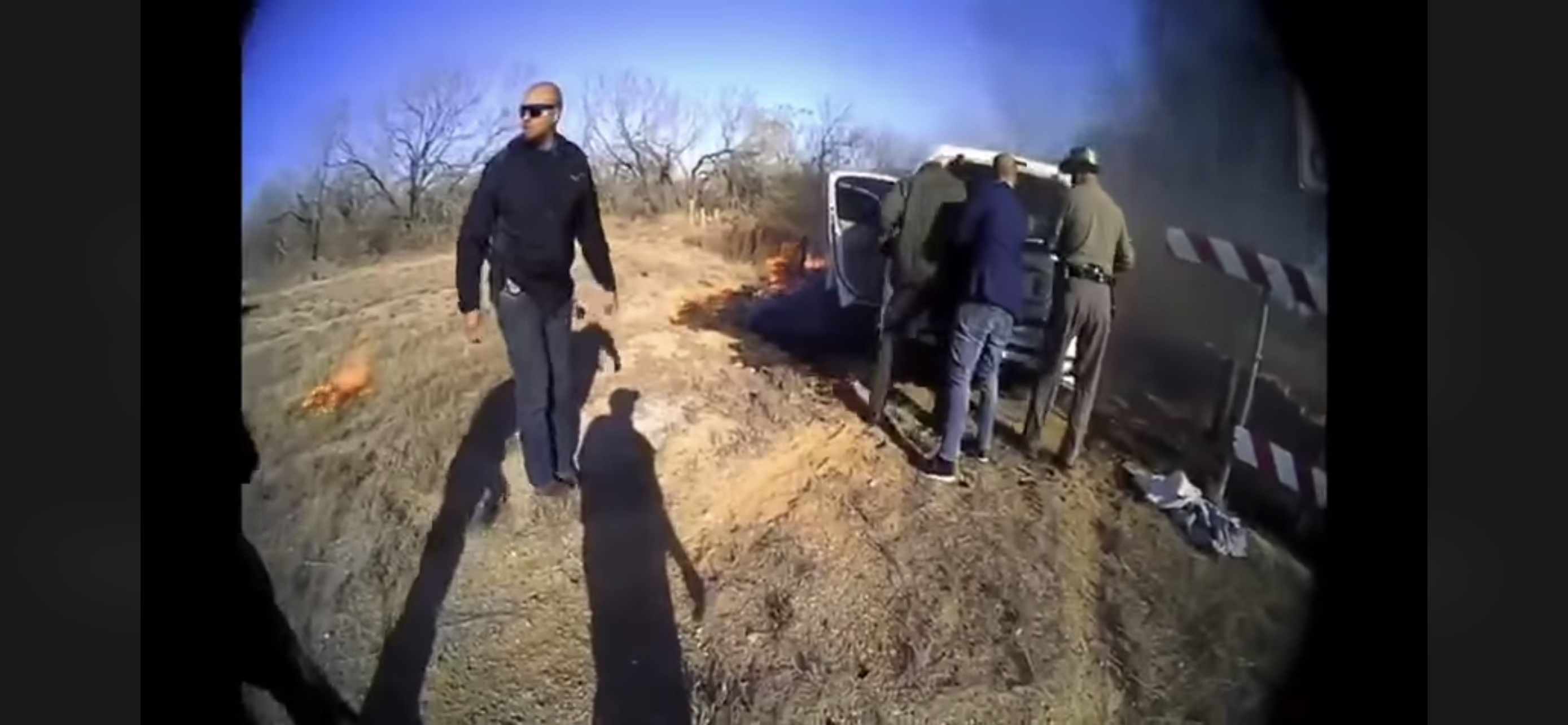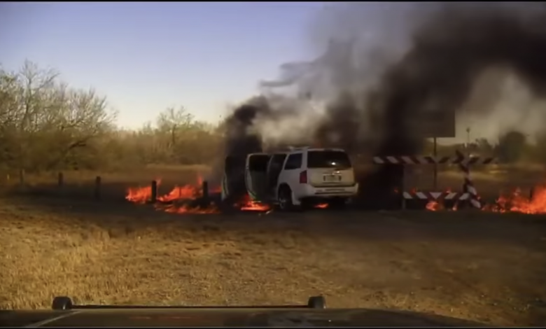 Una mujer fue rescata por agentes Seguridad Publica de Texas al interior de un vehiculo que se encontraba incendiándose, luego de una persecución por toda la Carretera 35 en Cotulla, Texas, conducida por un traficante que tras colisionar provoco el siniestro.