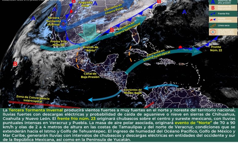La Subsecretaría de Protección Civil de Coahuila (PC) informó que para hoy el desplazamiento de la Tercera Tormenta Invernal producirá vientos fuertes a muy fuertes, así como ambiente muy frío a extremadamente frío sobre el norte y noreste del territorio nacional, además de probabilidad para la caída de aguanieve o nieve en las zonas serranas de la entidad.