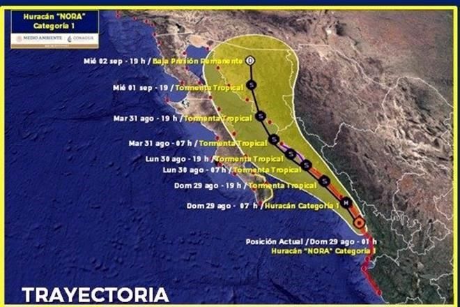 De acuerdo a la trayectoria prevista para «Nora», se espera que a las 19:00 horas de este domingo se degrade a tormenta tropical, y que impacte en Sonora el 31 de agosto.