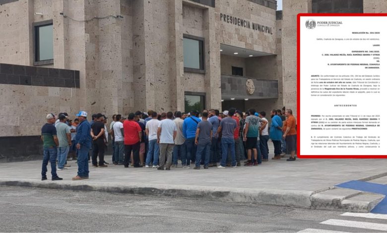 Piedras Negras, Coahuila.– El Ayuntamiento de Piedras Negras, encabezado por el alcalde Jacobo Rodríguez González, volvió a perder un caso legal, esta vez frente al Sindicato Único de Trabajadores de Obras Públicas. El Tribunal Laboral con sede en Saltillo resolvió a favor de los sindicalizados y ordenó su reinstalación inmediata, además del pago de salarios y prestaciones caídas correspondientes a ocho meses.