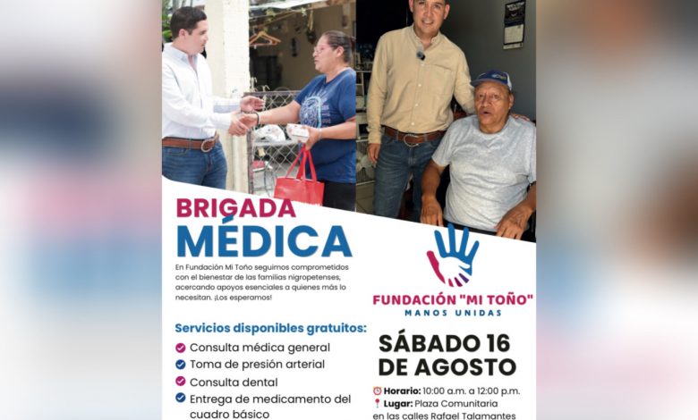 Piedras Negras, Coahuila.- Con el firme propósito de seguir acercando la atención médica a quienes más lo necesitan, la Fundación Mi Toño llevará a cabo este sábado 16 de agosto una Brigada Médica Gratuita en la Plaza Comunitaria de la Colonia Valle del Norte, ubicada en las calles Rafael Talamantes e Iztaccíhuatl, en un horario de 10:00 de la mañana a 12:00 del mediodía.