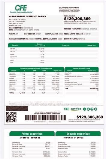 Sin embargo, en redes sociales circuló la fotografía de un recibo de luz que, se afirma, es el de AHMSA por un adeudo de 129 millones 306 mil 369 pesos.