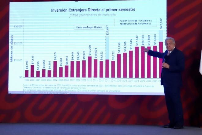 El Presidente Andrés Manuel López Obrador presumió el aumento de la Inversión Extranjera Directa (IED), que en el primeros seis meses de 2022 fue de 27 mil 511.6 millones de dólares, 49.2 por ciento más respecto a igual periodo del año previo.