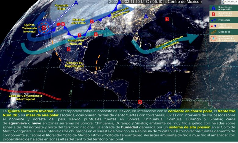La Subsecretaría de Protección Civil de Coahuila (PC) informó que la Quinta Tormenta Invernal de la temporada se ubicará sobre el noroeste de México, en donde la interacción de la corriente en chorro polar, el Frente Frío 28 y su masa de aire polar asociada, ocasionarán rachas de viento fuertes con tolvaneras y lluvias puntuales fuertes, así como la caída de agua nieve o nieve en las zonas altas de Coahuila.