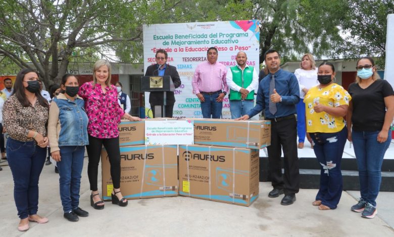 Aunado a este programa educativo la sociedad estudiantil se vio beneficiada con “Éntrale a la Educación Peso a Peso», ya que se entregaron 4 aparatos minisplits con una inversión de 51 mil 732 pesos aportados por el Municipio y la sociedad de padres de familia, además la Presidenta Municipal entregó útiles escolareas y mochilas, kits de limpieza y material deportivo.