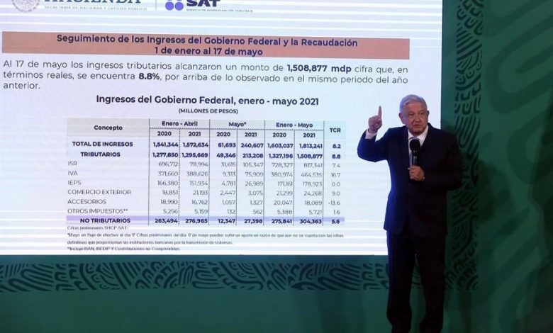 El Presidente Andrés Manuel López Obrador afirmó que en el periodo de enero a mayo se registró una recaudación de un billón 813 mil 241 millones de pesos, 200 mil millones de pesos más respecto al mismo periodo de 2020.