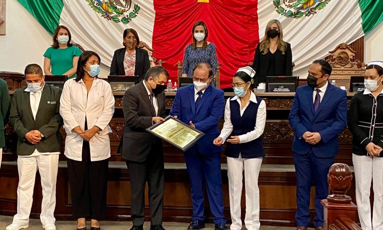 Roberto Bernal Gómez, Secretario de Salud en la entidad, acudió al recinto legislativo acompañado por la Jefa de Enfermería Estatal, Dora Elena Mottu Campos, para recibir esta distinción por parte del diputado presidente de la Junta de Gobierno del Congreso del Estado, Eduardo Olmos Castro.