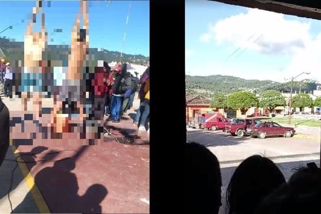 Los hombres fueron colgados de las manos en ropa interior en los aros de baloncesto de una cancha deportiva de la cabecera municipal, donde habitantes que los capturaron amagaron con prenderles fuego.