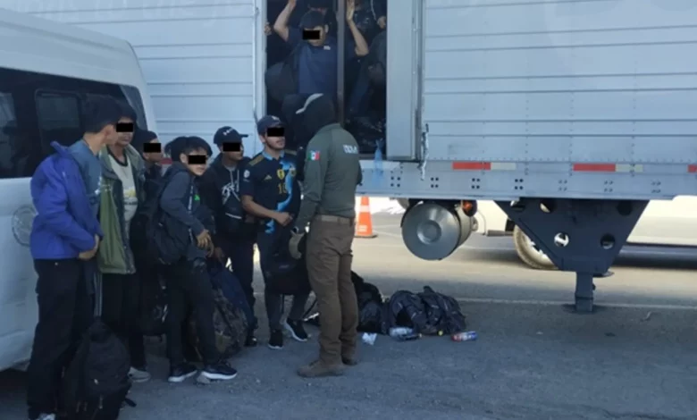 Se indicó que al inspeccionar un tractocamión con doble semirremolque fue cuando fueron localizados los migrantes.