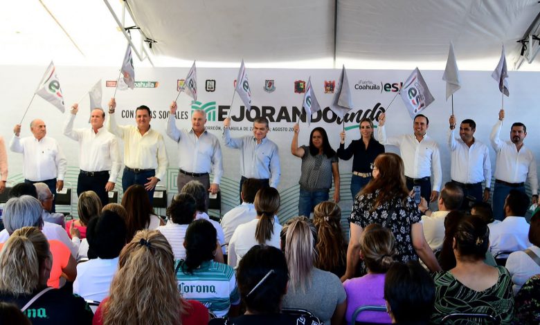 “Hoy, el Gobernador arranca la segunda etapa de ‘Mejora Coahuila’, e inicia con este gran eje que se sustenta en ‘Mejora Tu Colonia’, con cuartos, drenaje, techos y más”, precisó.