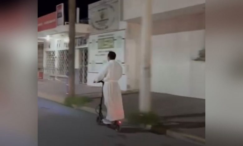 Sacerdote y quién es encontraba en la parroquia de Guadalupe debería ir a oficiar misa a otra iglesia de esta misma región sufrió la descompostura de su auto por lo que le pidió a otro sacerdote que si le facilitaba su patín del diablo para desplazarse y fue en ese momento en que se dirigía hacia la otra parroquia cuando varios conductores lo captaron a bordo de este vehículo mini eléctrico.