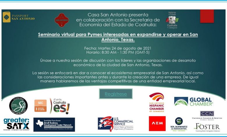 La Secretaría de Economía de Coahuila (SEC) y la Casa San Antonio llevarán a cabo un seminario virtual el próximo 24 de agosto, en el que se dará a conocer el ecosistema empresarial de San Antonio, Texas, así como las consideraciones importantes antes y durante la creación de una empresa.