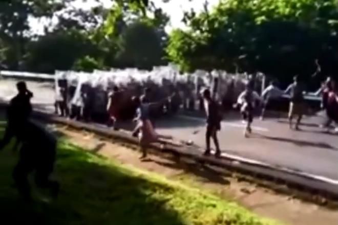 El operativo continuó y un kilómetro después la GN intentó asegurar a otro grupo de migrantes pero estos enfrentaron a los oficiales lanzado una lluvia de piedras.
