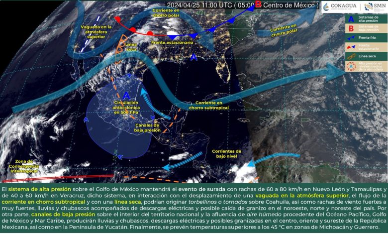 La Subsecretaría de Protección Civil del Estado (PC) informó que, durante este jueves, el sistema de alta presión sobre el Golfo de México mantendrá el evento de surada, con fuertes rachas de viento que podrían originar torbellinos o tornados en Coahuila.