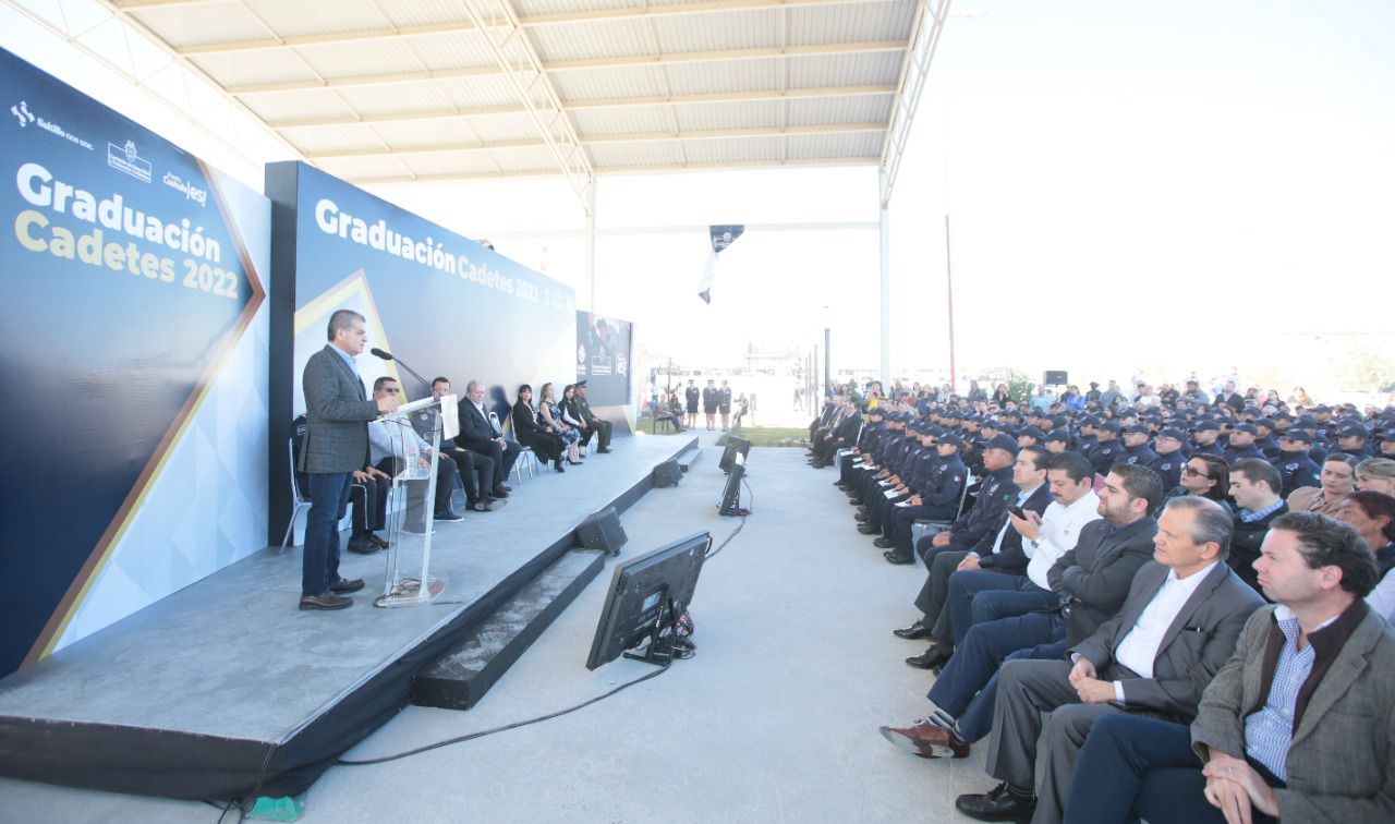 El gobernador Miguel Riquelme felicitó a todos los nuevos integrantes de la Policía de Saltillo y recordó cómo se han ido profesionalizando los elementos de Policía en toda la entidad en todos los ámbitos.