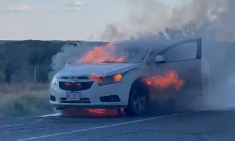 Un automóvil compacto de la marca Chevrolet, color blanco, terminó envuelto en llamas la tarde de este domingo mientras circulaba por la carretera 29, en el municipio de Zaragoza, Coahuila.