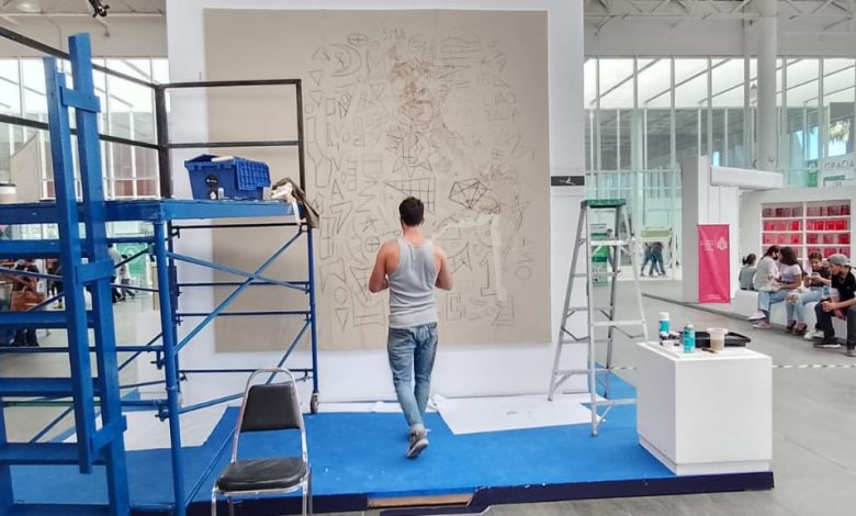 Filippo Giusti es oriundo de Italia, pero radicado en México hace tiempo, y tiene la encomienda de terminar el mural oficial de la FILC para entregarlo el día de la clausura, que será el domingo 26 de septiembre.